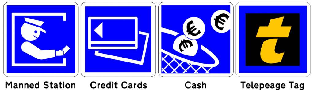 Do not use the télépéage (T) lanes – these are for people with electronic payment tags. Just look for ones with the cash or card symbol! Look for the green arrow ⬇ to show you where to go.